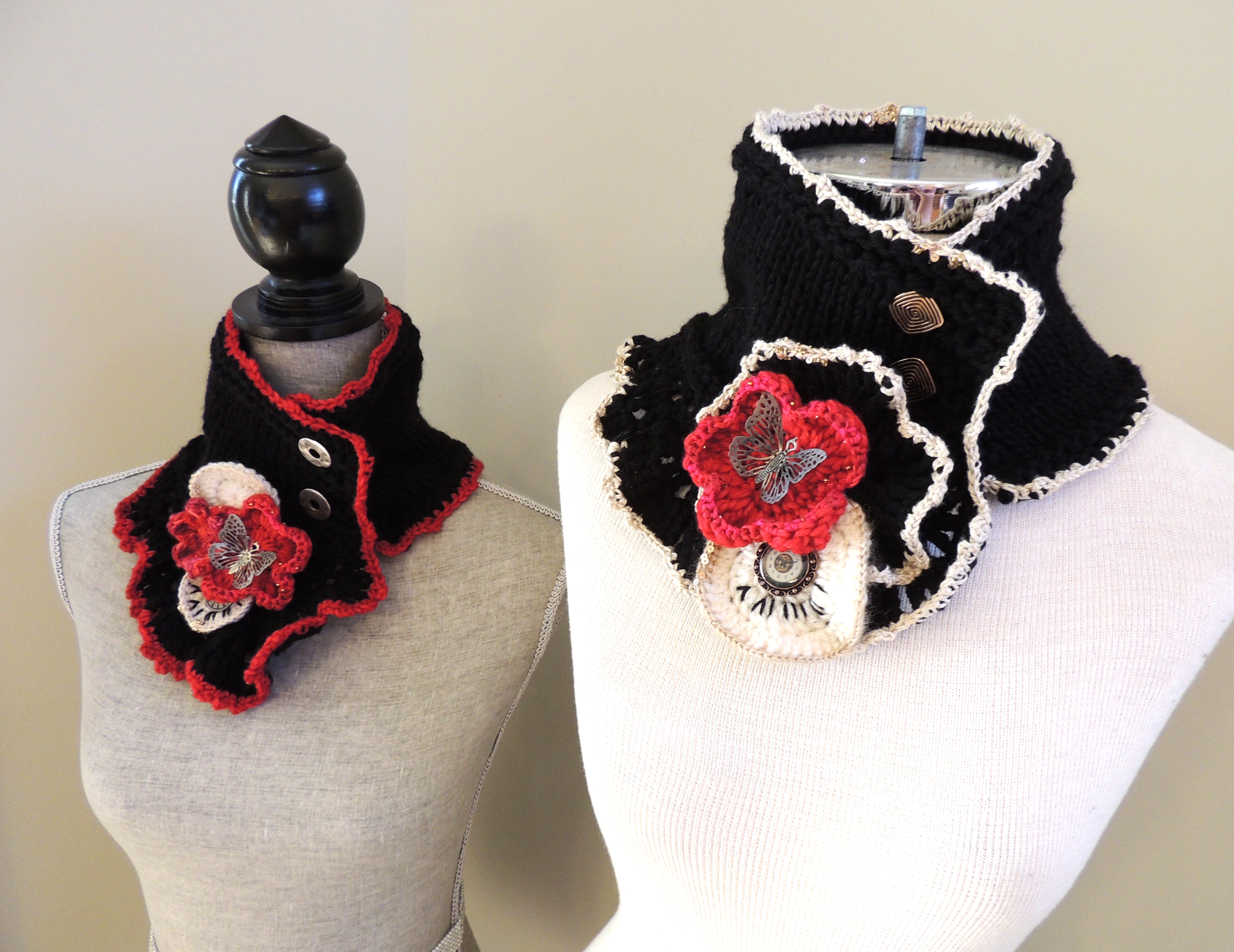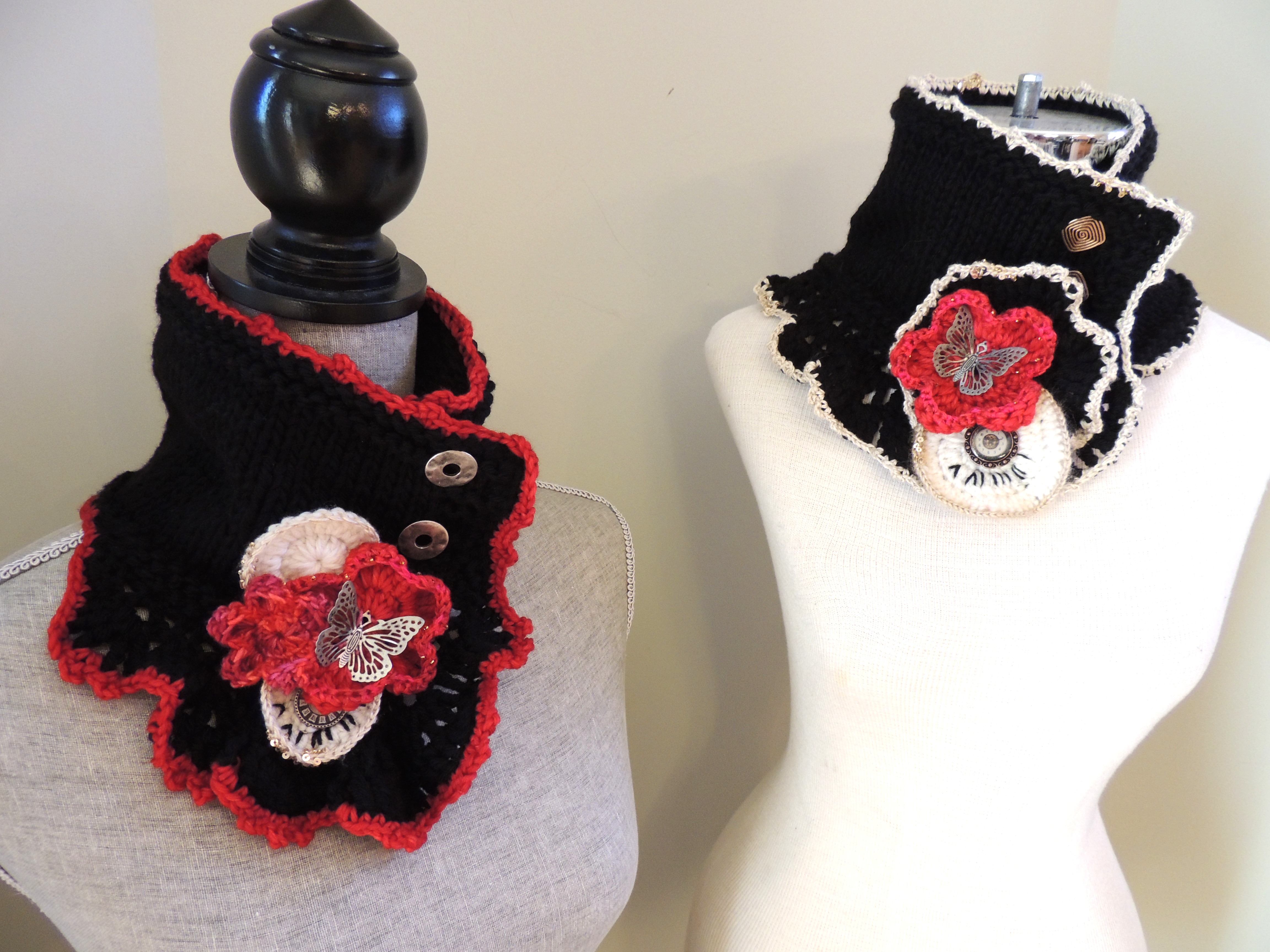 A sneak peek into the Opera Art Project designs for the up coming season of the Edmonton Opera. As I have mentioned in previous blogs I have the pleasure of designing with a group of amazing local Artists in the Opera Art Project. These two collar style scarves are one of a kind pieces and add a unique touch to your wardrobe. I will go more into the designs and what overall design is symbolic for as well as the embellishments. These two designs pertain to all three Opera’s this season in one way or another. The gold bling silk yarn, by www.artyarns.com is for the 50th Anniversary of the Edmonton Opera.