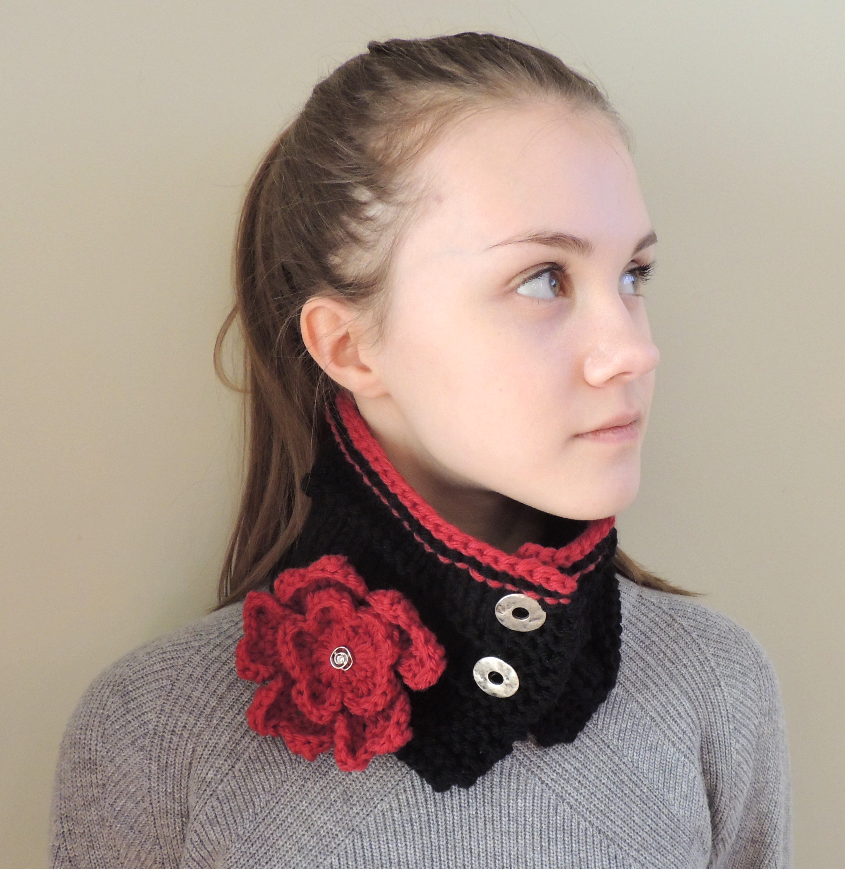 Treasured Hearts…Valentines Scarf and Fingerless Gloves set. The other day I was thinking about designing something for each holiday of the year, just for fun. Valentines being the next one in line I went to my yarn stash and started looking over the many different colours I could choose for this Holiday of Love. After deciding to go with a classic colour way of black and red I grabbed my knitting needles and began a special Valentines Scarf and Hand Warmer set. This design has a more contemporary feel to the overall piece with the accent “flower” in a broche style so you can wear this scarf with or without the broche.