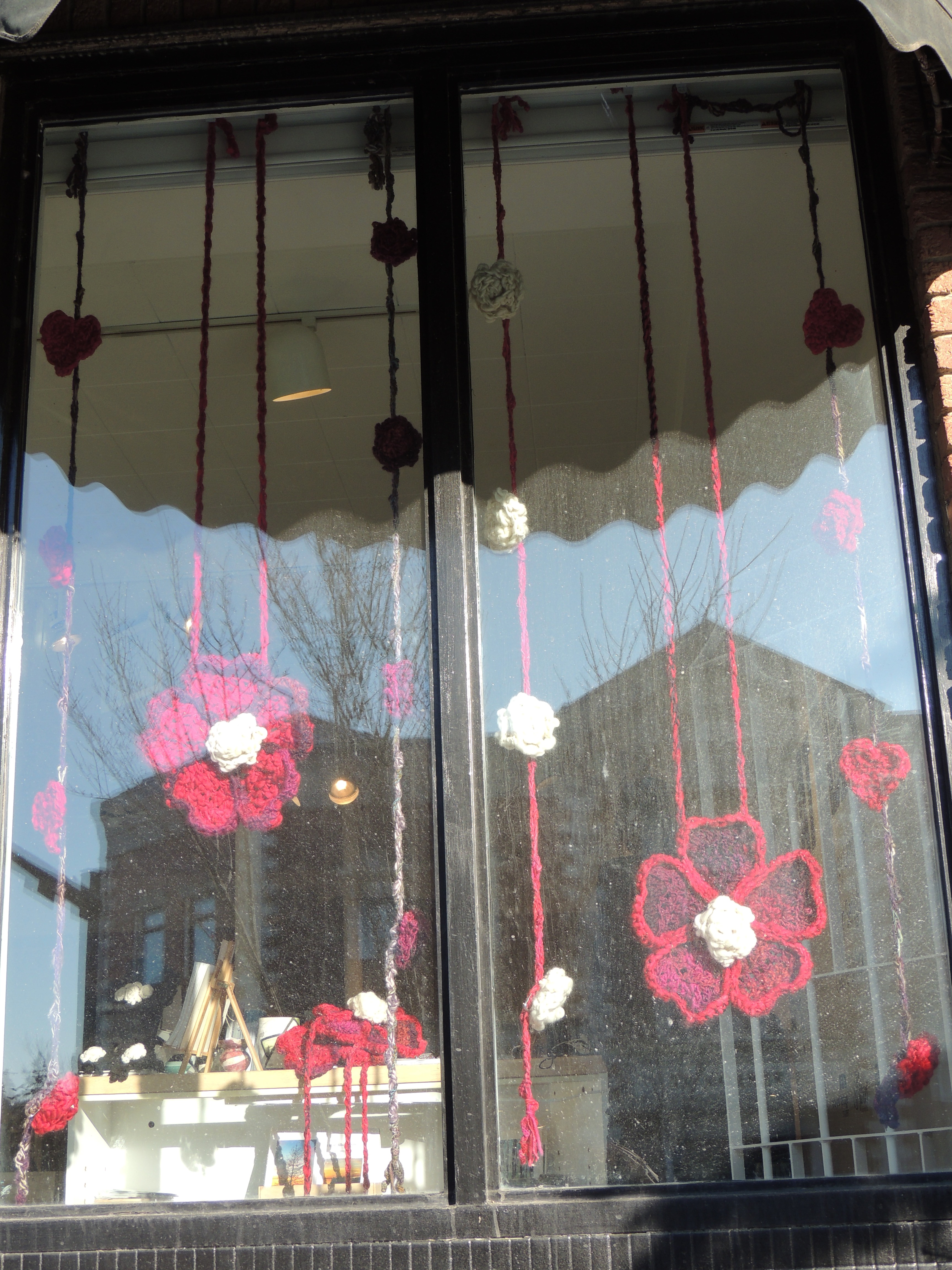 I was recently asked by the Art Gallery of St. Albert to design a fun and bold window display to warm the cold days of February. My thoughts started flowing and I immediately began thinking of ideas that could incorporate both the Valentines theme that warms our hearts and the warmth of the coming spring. With that in mind I chose to work with a colour palette of reds, whites, pinks and purples to enhance the warmth in the overall theme of the display. Today was the set up day which was kind of nerving as you never really know how it will look till you see it in the space it was intended for.