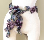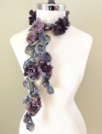 The Floral Twist accent scarf can be worn in many different ways and be used to dress up your favourite T shirt, sweater, shirt, or jacket. A touch of bling in the glass button adorns each flower. Various purples were used to make the 3 different flowers on this design. There will be a cotton version as well in neutrals and bright and bolds to warm the day.