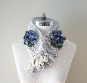 floral crochet scarf blue grey ivory purp