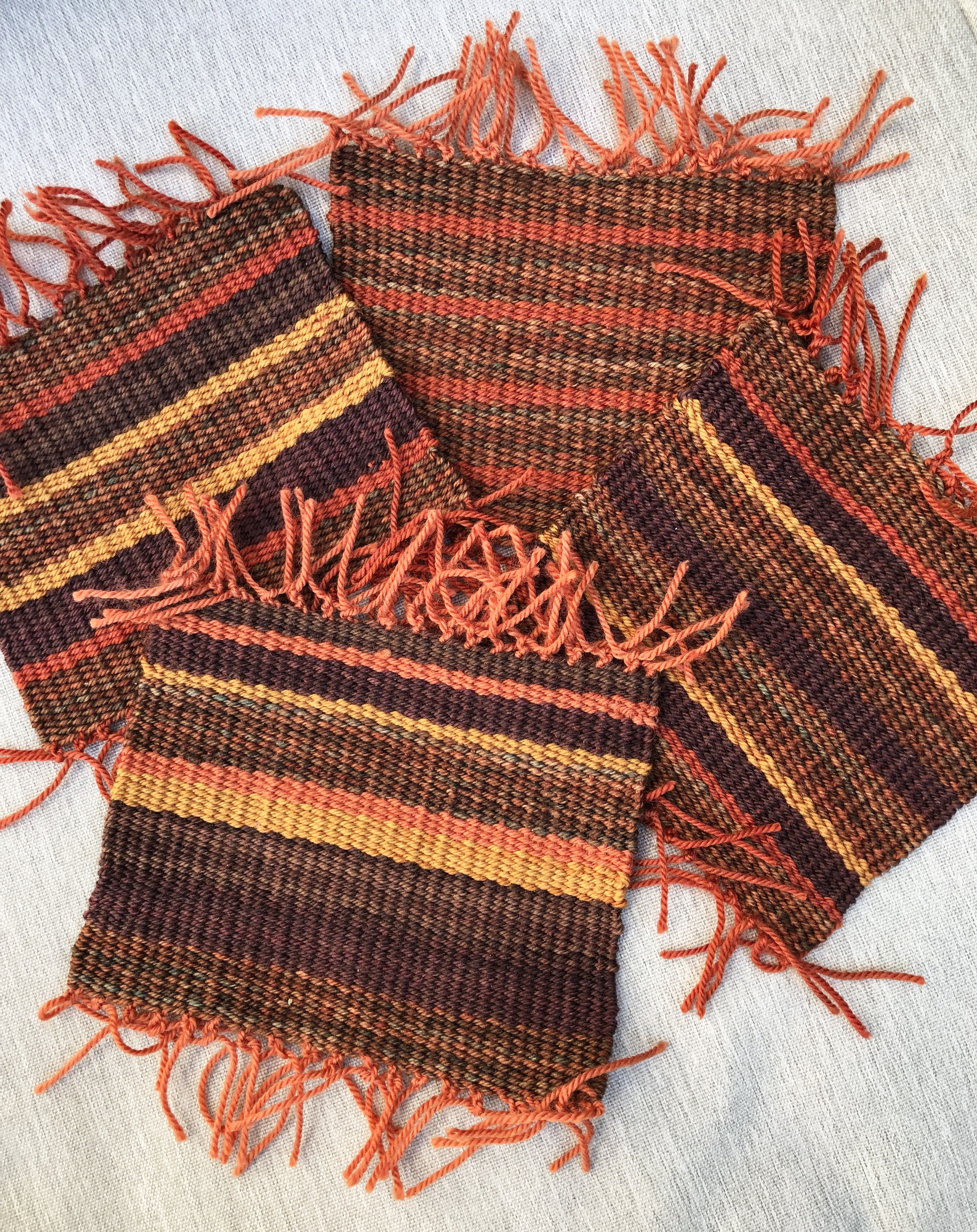 With Fall just ending in my neck of the woods as we have already had several dustings of snow I wanted to share one of my recent weaving projects with the essence and colours of the autumn season. These are a set of 4 mug rugs I made with my loom perfect for making mug rugs. I like to make seasonal sets for my family so we can each enjoy the beautiful colours and patterns I have woven.