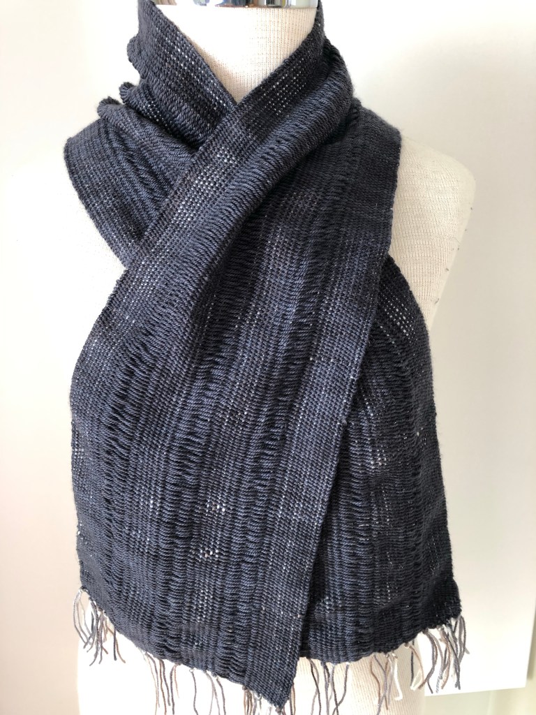 Weaving a space warped scarf was on my list of “to do”. I love the modern essence of this scarf with the beautiful texture that evolves from leaving spaces on the warp. I enjoyed the simplicity and calming ease of plain weave with the added bonus of this lovely textured outcome.