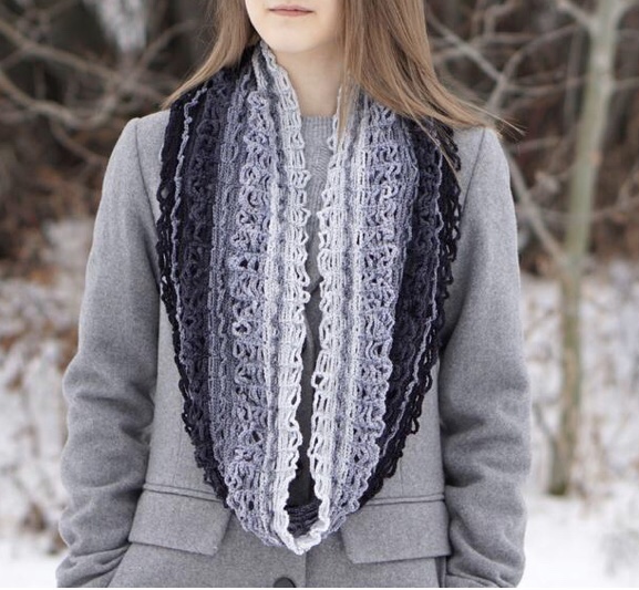 Fiesta Lace Scarf Crochet Pattern is an easy to crochet pattern. Designed with Fingerling/Sock weight yarn. You can use any sock weight yarn. Perfect for the Party of Five yarn shown here. The Fiesta Lace Scarf pattern is designed by myself, Valerie of Valerie Baber Designs and can be worn in many different styles. It’s an easy to crochet pattern. You can use most Fingerling/Sock weight yarns for this design.