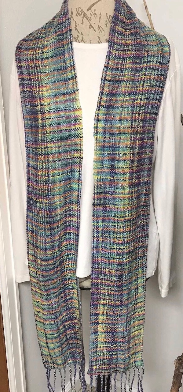Valerie: On my version I chose to make it shorter as I wanted a Fall scarf to wear when out for a walk that was smaller in size. I also wanted to try it with two different colours on the warp and love that it added a stripe effect to the design. I used a darker hand painted yarn with softer colour on the warp and a natural/ivory colour on the weft. Using the ivory/natural on the weft had a subtle effect when I washed the scarf leaving the two other colours to stand out even more. I can’t wait to enjoy wearing this one. I will always think of our great friendship and the enjoyment we had making it every time I wear it.