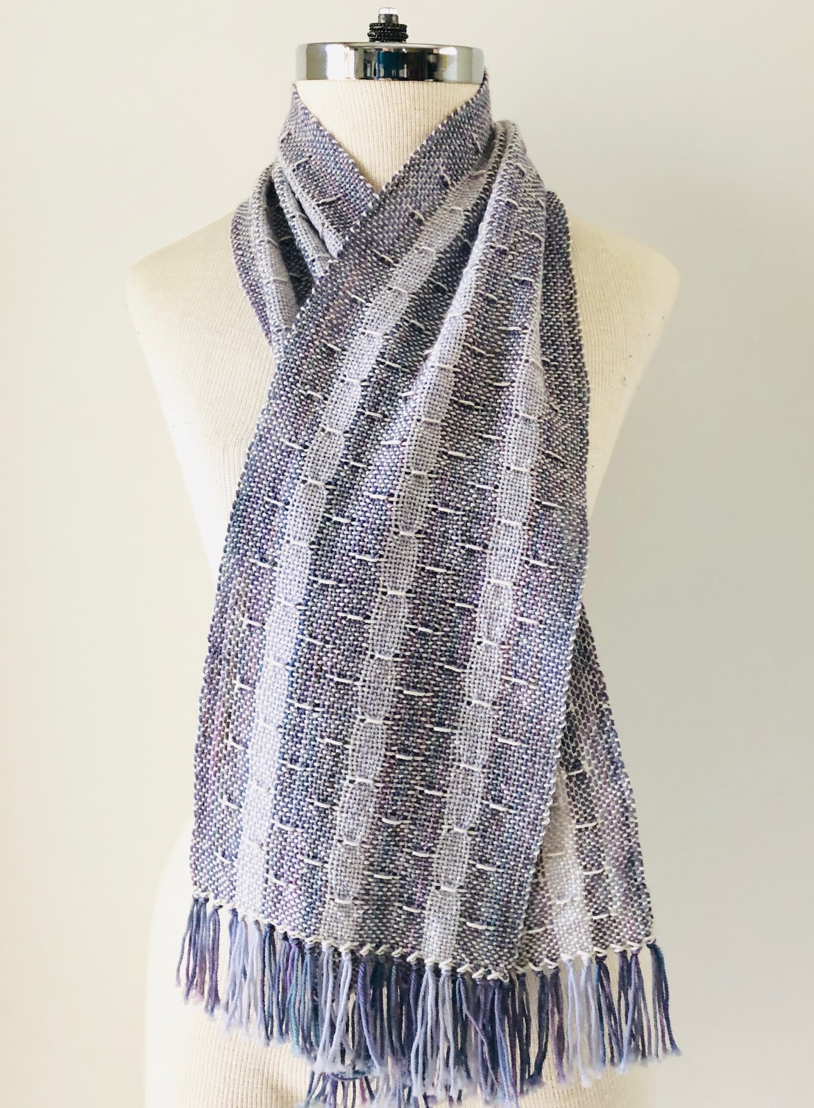 The first scarf is the Friendship Factor scarf. We both went through our weaving magazines and patterns and settled on this lovely one available on Handwoven Magazine’s Little Looms edition, Easy Weaving With Little Looms Summer 2020 – Long Thread Media We chose the Plumage Scarf to weave as our first Friendship Factor scarf. The photo below is from Handwoven Magazine (handwovenmagazine.com) and I hope they don’t mind that I used it as I promote this wonderful weaving pattern. If you are looking for inspiration for your weaving project Handwoven Magazine is a wonderful place to start. Beautiful photo’s and patterns as well as history of weaving, artist, yarns and more are in each volume. You can even buy it online so you can look at it on your phone and computer. I love looking through the older issues and seeing how weaving has evolved over the years. This pattern uses Brooks Bouquet as the main pattern. I really like weaving this pattern it is an interesting design yet easy to do. I previous made a different scarf with the Brooks Bouquet in gray that had a lacey effect, but with this scarf the pattern is spaced differently giving a more texturized look.