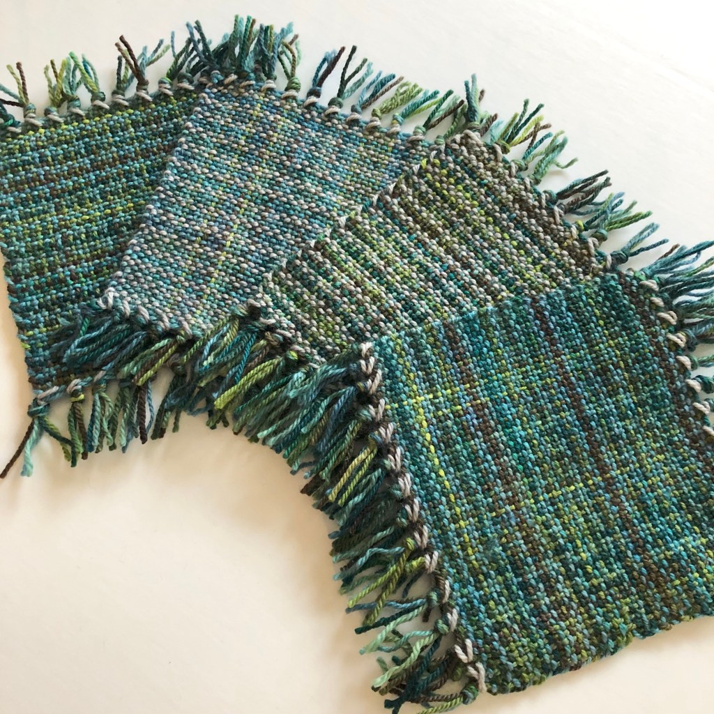 Mountain mug rugs are inspired by the beautiful colours of the mountains, trees, and lakes and rivers. This set was made for a family who loves hiking in the mountains surrounded by beautiful foliage and trees of green. They spend time fishing in the rivers and lakes as they enjoy the view around them of the beautiful blue waters. Memories of the wonderful moments are woven into the colours of the Mountain Mug Rugs.