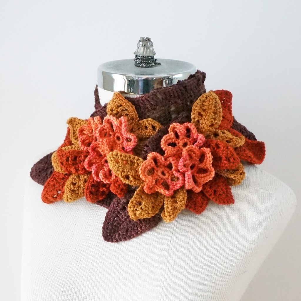 Night Garden Floral Scarf crochet pattern has a beautiful floral design on a scarf base that can be worn long or as a neck warmer for different looks. Take a stroll along the garden, under the moon and stars in the Night Garden scarf. A beautiful evening spent enjoying the flowers and foliage found along the path. Embellished with flowers and leaves in beautiful dark tones of purple to blue, the Night Garden Scarf is reminiscent of an enchanted evening. This design can be made as shown in various colours using mini skeins or yarn from your stash. Made with a sock weight/fingerling weight yarn. Pattern is written using US crochet terminology.