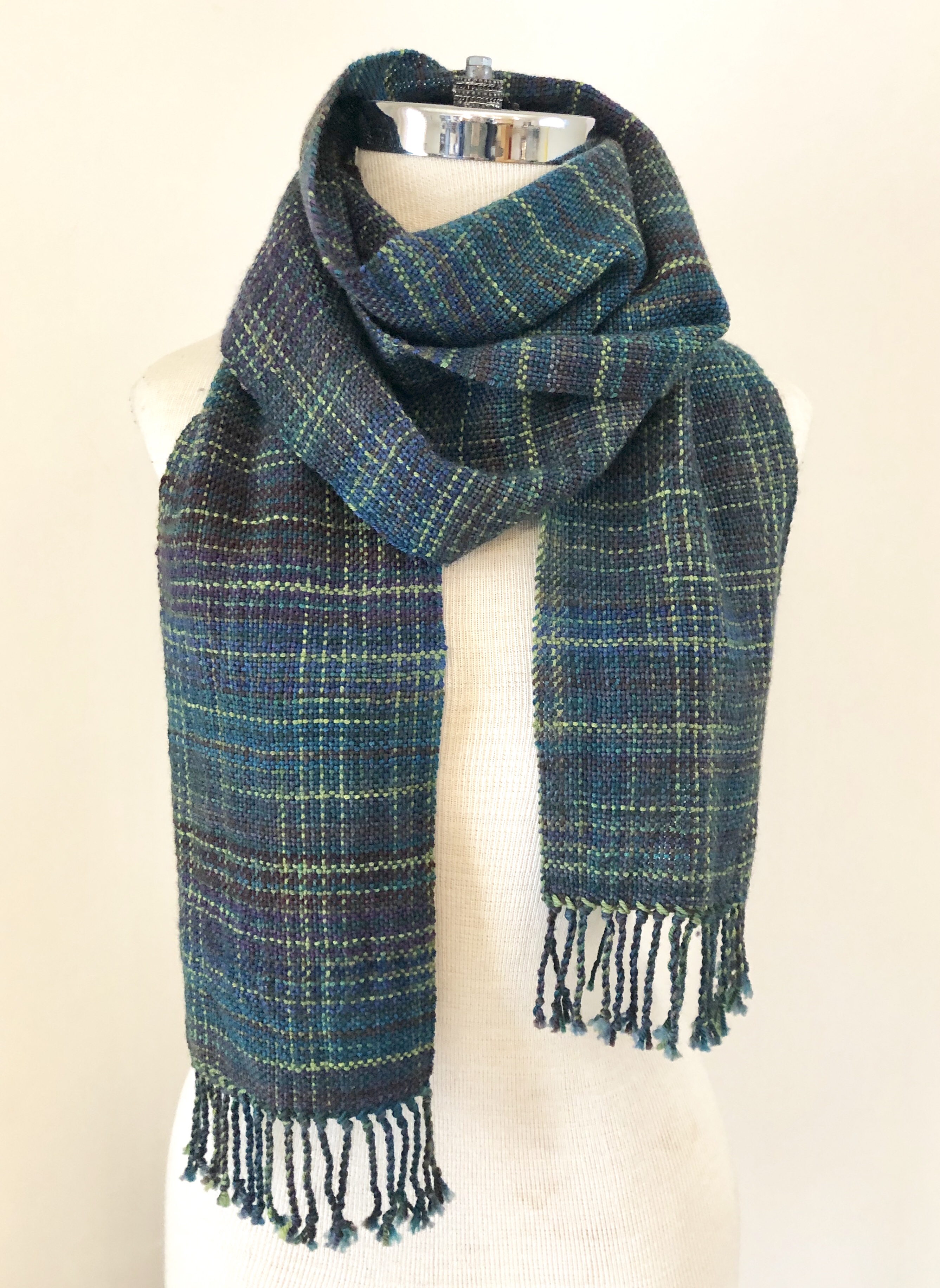 Using lightweight yarns for a scarf was a new adventure and one that I will repeat many times, I am sure. The lightweight wool is soft, warm, and very light. This makes a lovely hand. When weaving, using the floating selvedge kept my fringes neat and mostly the same length. It also helped keep the fringes tidy after pulling the scarf off the loom – I just pulled the string through when it was time to twist a group of tassels. Having the tassels exactly the same length isn’t necessary in this scarf since it drapes over you a couple of times. In fact, it’s more fun to have unexpected elements, like varying lengths in tassels, in the finished cloth.