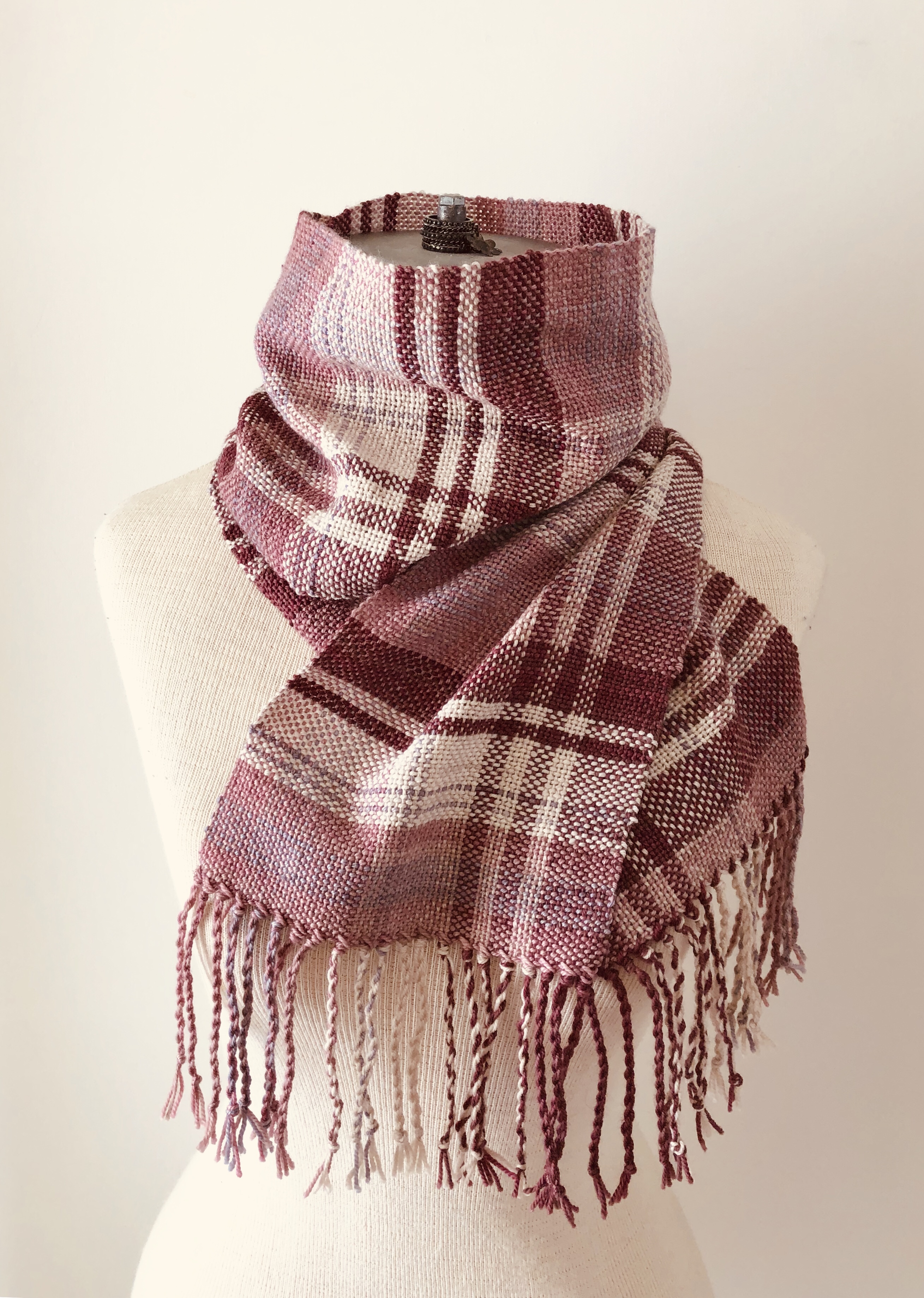 The pattern, which came from WEBS, was easy to understand and had a warping sequence that neither Valerie nor I had seen before – threading holes with a different color than the corresponding slot. This created thin stripes in the warp. Once warping was completed, it only took less than a week of evenings to weave this scarf, so it would make a nice last-minute gift to weave for someone if you are in a hurry. Just allow yourself time to wash your scarf and to twist the tassels.