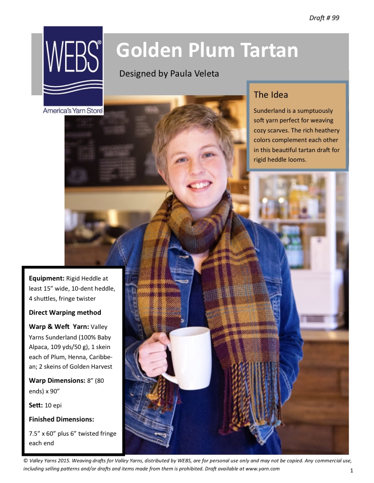 The friendship factor adventure continues with a terrific Golden Plum Tartan scarf by Paula Veleta shown below. This beautiful scarf design is perfect for any wardrobe and a wonderful pattern to weave. Lisa and I spent some time discussing what we wanted to try next and we both felt weaving plaid or tartan was the next journey we wanted to explore. I love the Golden Plum Tartan pattern that Lisa found on WEBS you can link to the pattern here: Valley Yarns #99 Golden Plum Tartan PDF at WEBS | Yarn.com There is also a yarn kit you can purchase with the colours in the photo to make your yarn choice easy. The traditional tartan pattern was mixed up with a beautiful technique to make a lovely single strand stripe in the pattern instead of a thicker stripe normally seen. This give a modern touch to the design that we really enjoyed trying out. I hope they don’t mind me posting a photo of the pattern below as I promote how great this pattern really is.