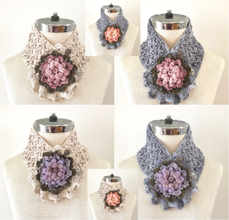 Floral Dahlia Scarf choose from an ivory/linen colour or beautiful gray scarf base and 1 beautiful floral dahlia brooch of your colour choice from purple, pink or apricot. Crocheted with luxurious yarns, handmade and designed by myself (Valerie Baber). Choose from a beautiful ivory/linen colour or the perfect gray as your scarf base made with luxurious hand painted merino wool yarn in a textured pattern. Other similar colourful scarves available on my other listings. Each scarf is finished off with beautiful metal buttons.