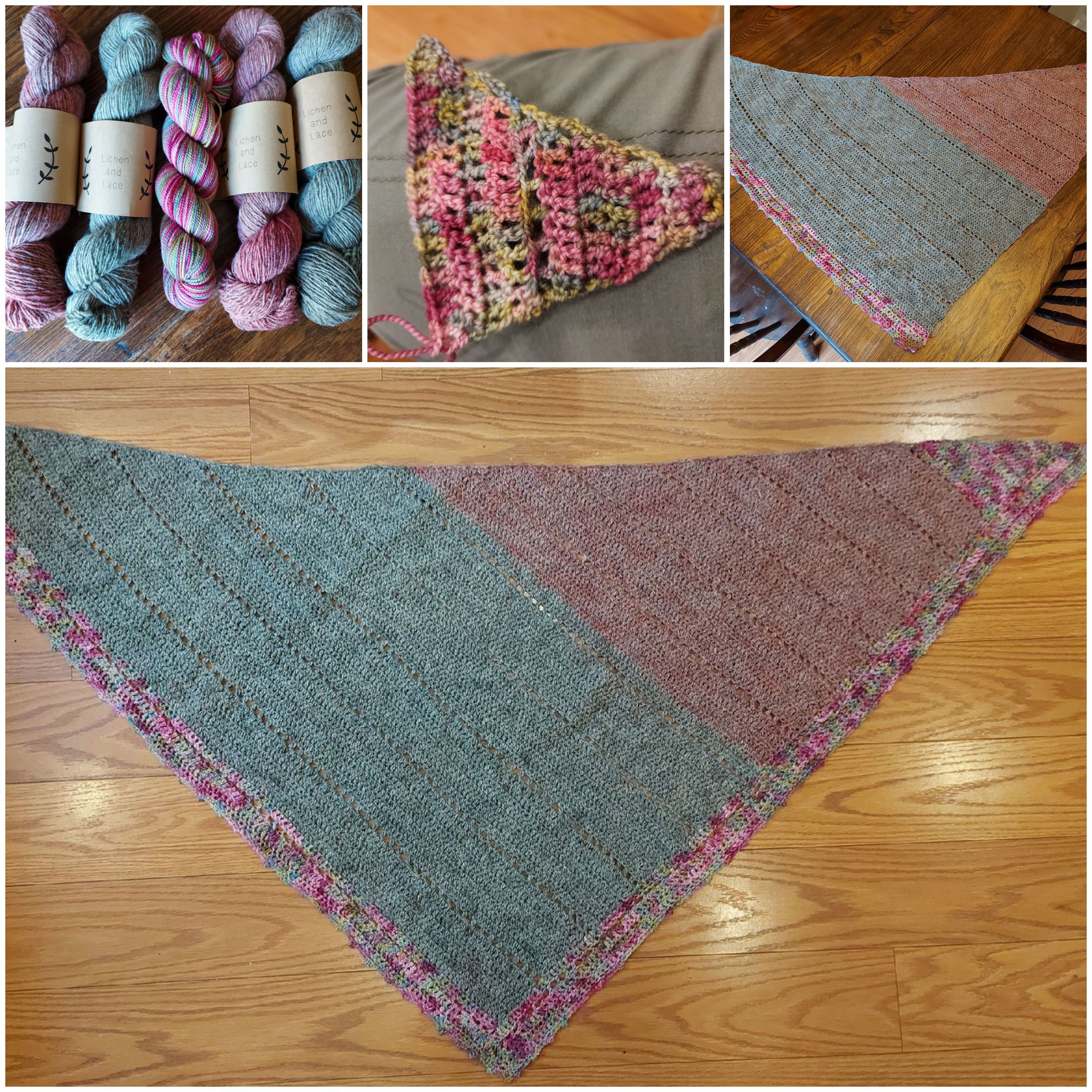 Our journey began with choosing a pattern we both liked that was easy enough for Nancy to pick up quickly. Working on a project with a friend is always enjoyable. Like Nancy said it is a great way to enjoy time together even when you are far apart. On my shawl I choose to use yarn from my stash. I had purchased some beautiful yarns from SweetGeorgia Yarns in the Tough Love Sock yarn to make a blanket a year or so ago in beautiful gradient colours of burgundy to a pink. To add some interest I added various colours of purple to the shawl in a gradient effect with stripes. The photo below shows the gradient yarns I first chose from burgundy to pink.