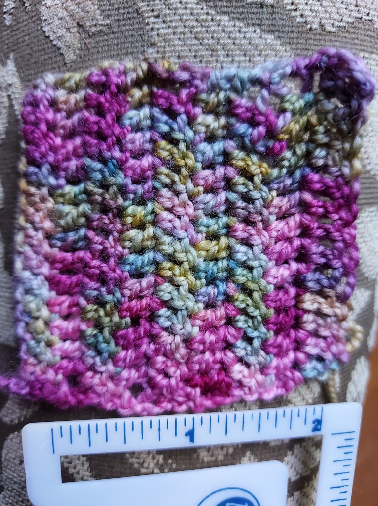 In starting the pattern with the Koigu skein (as I mentioned I’d never followed one for crochet before), I spent a fair amount of time working a few rows and pulling them out. The increases were giving me a hard time and were looking choppy. Given, however, that they were required from the very start, there was never a lot to redo. I was amazed at how quickly, my work moved along compared to knitting, I could get things going again and I was back on track. Also, I had my friend Valerie to answer any questions like how to make test swatches and, given the weight of the 2 different yarns, what needle sizes to use. She was easy to reach through text and it was simple enough to send her a picture of any issues I was having. Can you imagine doing this 25 years ago?