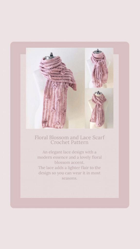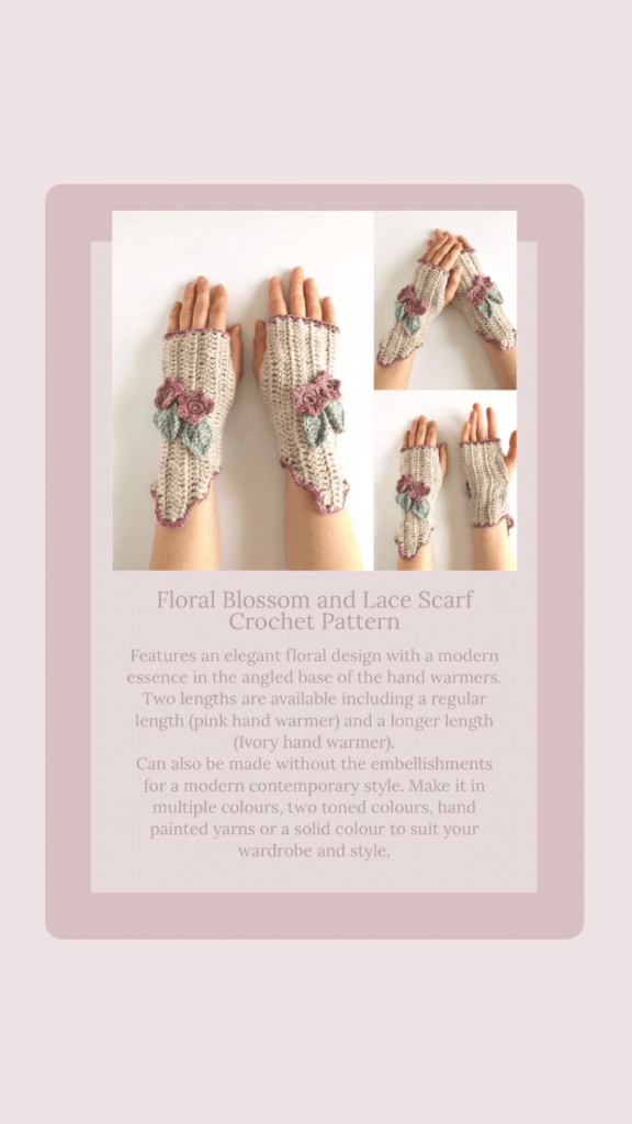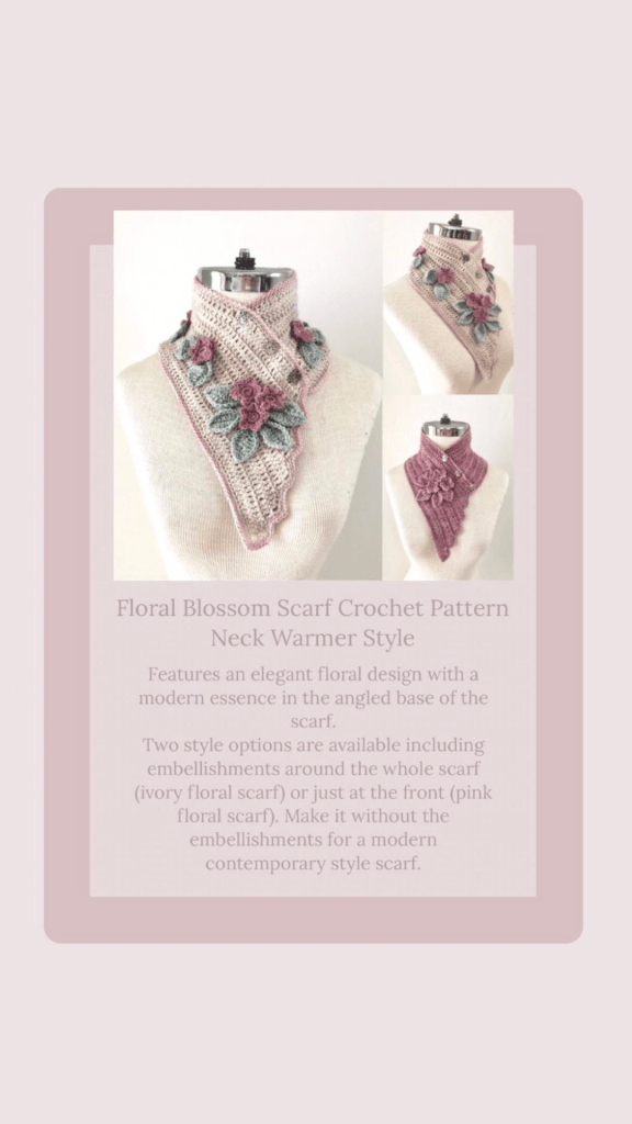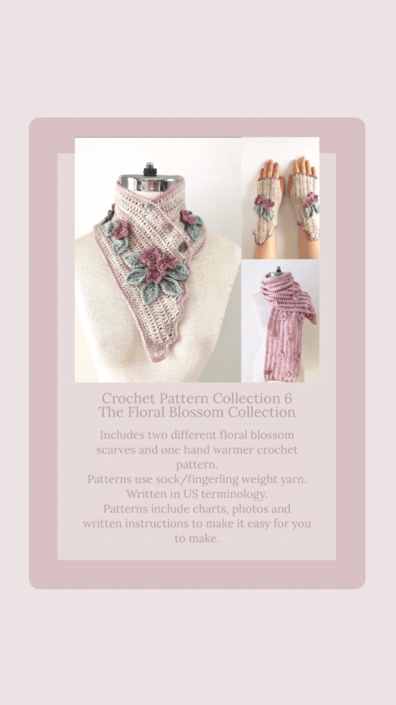 Crochet Pattern Collection #6, Floral Blossom Collection : Includes the Floral Blossom Neck Warmer Scarf, Floral Blossom Hand Warmers and the Floral Blossoms and Lace Scarf crochet patterns. These patterns have an elegant floral design with a modern essence in the style of the scarf and hand warmers. Inspired by the floral blossoms that adorn the trees and bushes in the spring giving us a sign of new beginnings and beautiful moments to come.
