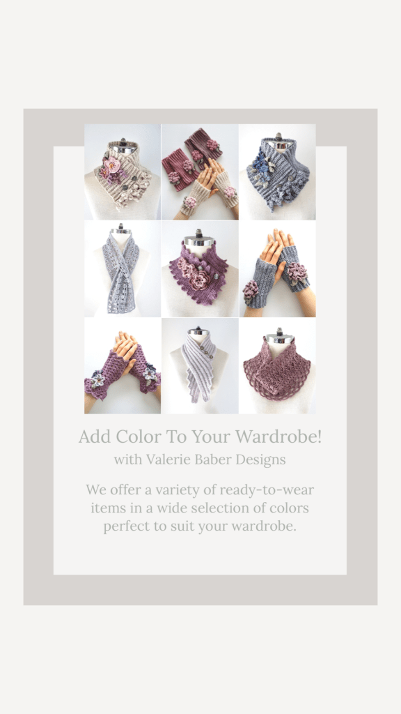 Add colour to your wardrobe with these beautiful scarf and hand warmer designs made and designed by myself just for you. Ready to wear and ship for your convenience. A collection of various styles perfect for any wardrobe. Other designs and colours are available as well as crochet patterns and yarn so you can make your own. Available on my Etsy store link below: