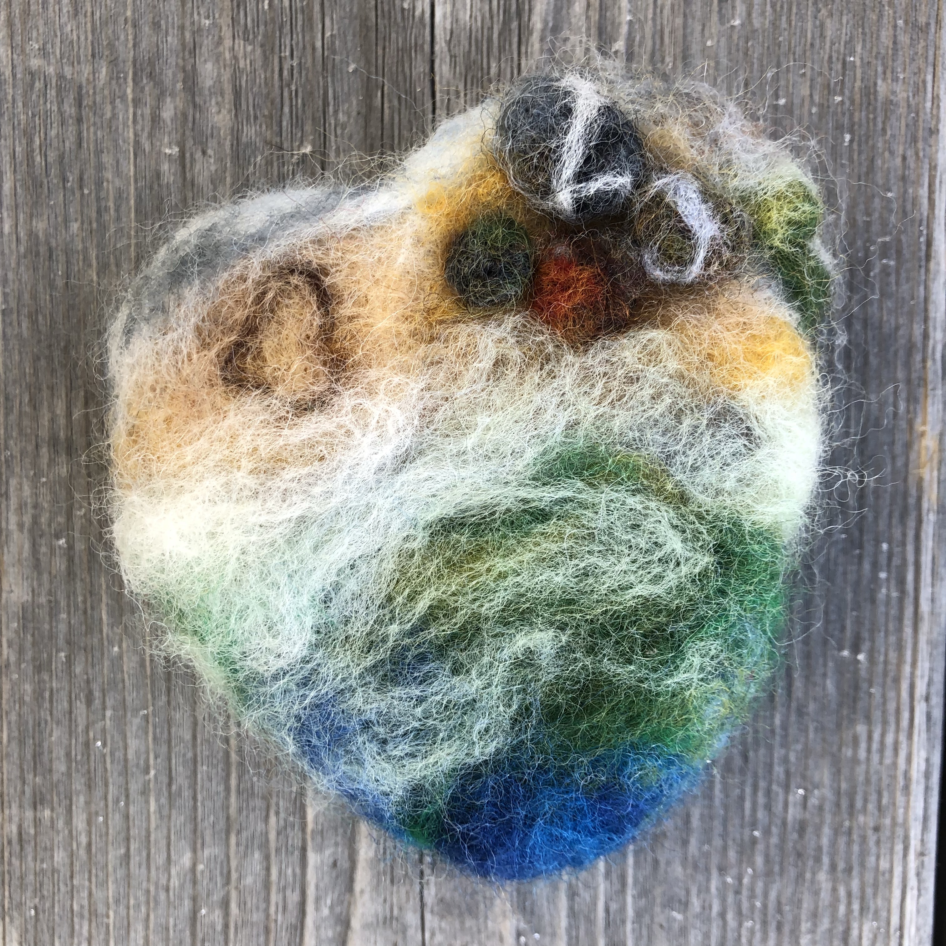 The colours on this felted heart are so beautiful! The blues and greens in the water, blues and whites in the sky, beige and golds for the sand, greens, reds, orange for the trees in autumn, the various colours on the pebbles topped off with the misty white fibre for the fog are the perfect selection for this scene. The second side (second photo) is a close up of the first side. On this side there is a heart drawn in the sand like you would on your beach adventure. The pebbles have white sections on them like you might see at the beach. On the first side you see the beautiful landscape scene in all it’s glory making you feel like you are standing there watching the waves splashing about walking along the waters edge. There are so many other features to talk about this beautiful felted heart, I would need a much bigger blog to cover it all. The fine details are so wonderfully done. It truly makes this design come to life. I hope that Lan will continue to create such beautiful artistic pieces. Lan’s blog is: https://pebbleseal.wordpress.com/
