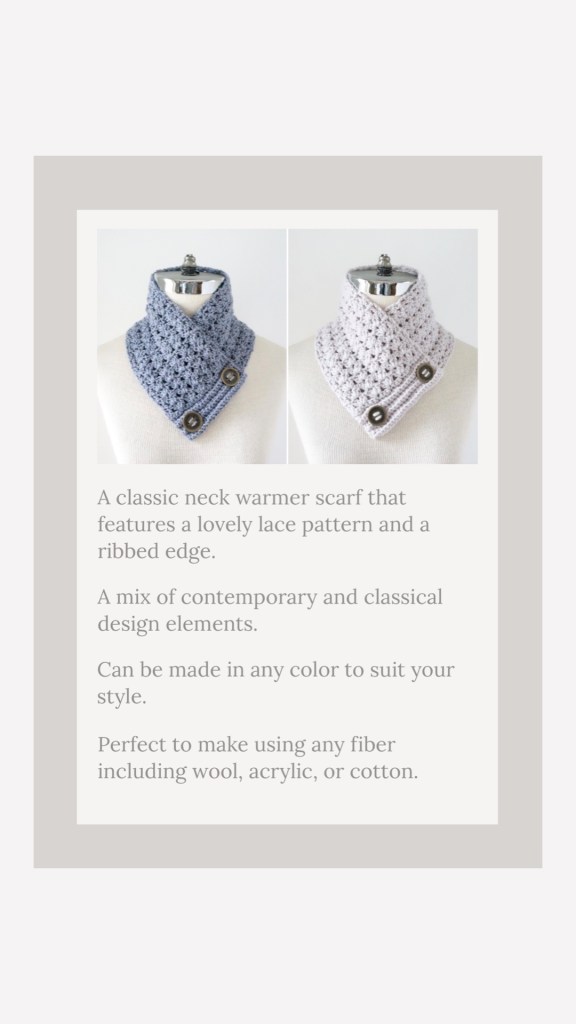 The Classic Lace Neck Warmer Scarf is a neck warmer style perfect for any wardrobe with a lovely lace pattern and a ribbed edge. Designed with a DK weight/Light Worsted weight yarn perfect for any wardrobe. This will be a favourite scarf to wear for years to come with the contemporary lace pattern and the classic design. Cozy up a cold day with this easy and quick to make lace scarf. Great pattern for all kinds of fibers from wool, acrylic, cottons and more. The Classic Lace Neck Warmer Scarf can be made in any colour combination including neutrals, bright and bold or soft pastels.