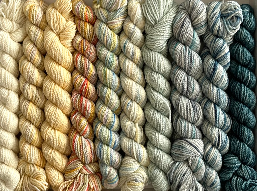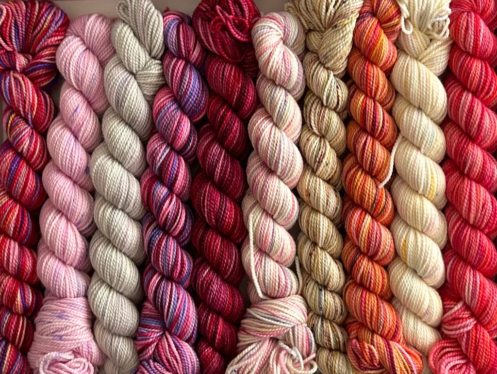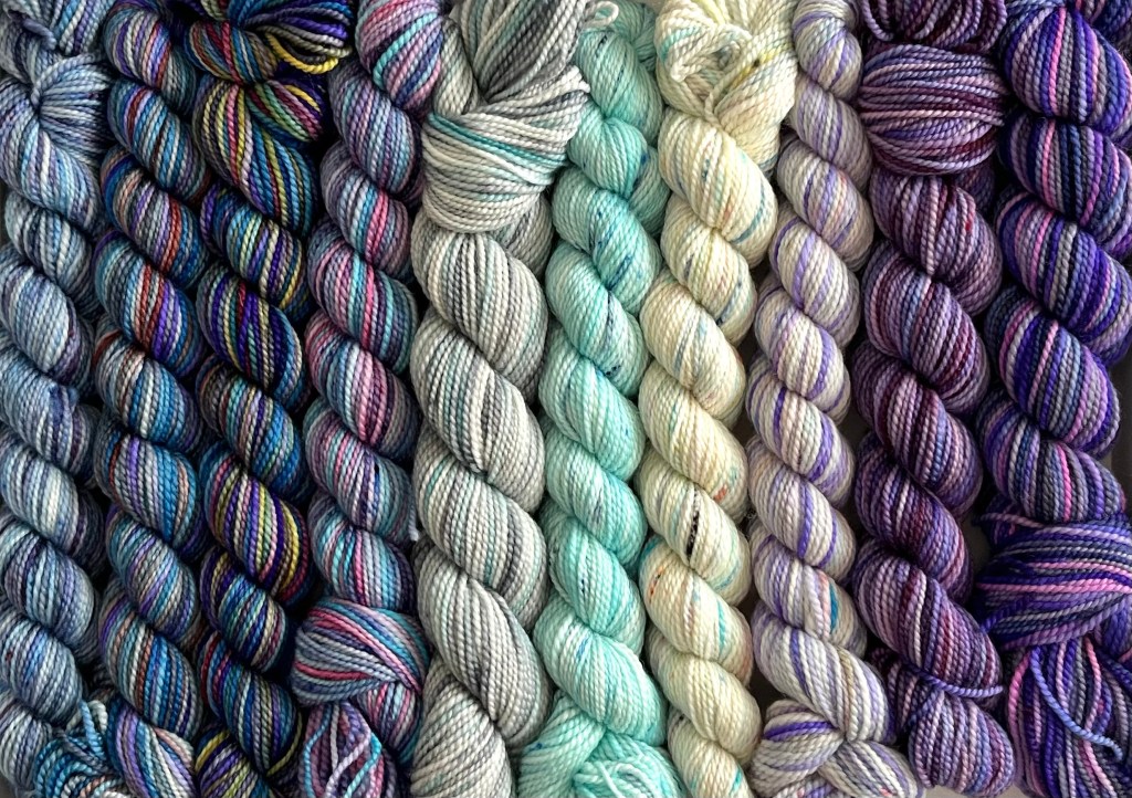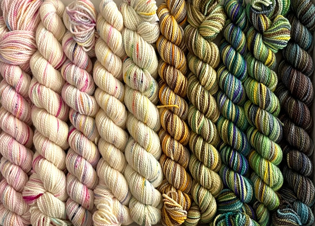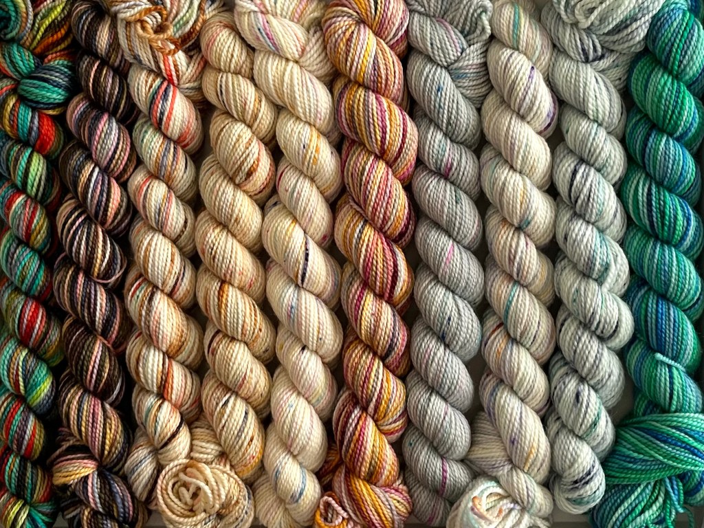 Made with 100% Merino Wool. There are 10 mini skeins in each pencil box at 87 yds/25g each mini skein giving you a total of 870 yards of beautiful hand painted yarn.
