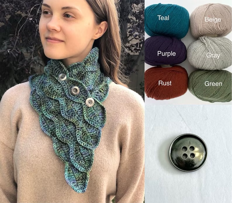 NEW! Yarn Kits! Crochet scarf yarn kit includes the Calming Waves Neck Warmer Scarf crochet pattern and 1 ball of DK weight 100% wool yarn and 3 beautiful metal buttons. Choose your colour at the time of purchase. This neck warmer style is perfect for any wardrobe. Designed with a DK weight/Light Worsted weight yarn perfect for any wardrobe. This will be a favourite scarf to wear for years to come with the contemporary lace pattern and the classic design. Also available as a pattern only on my other listings.