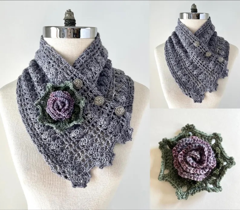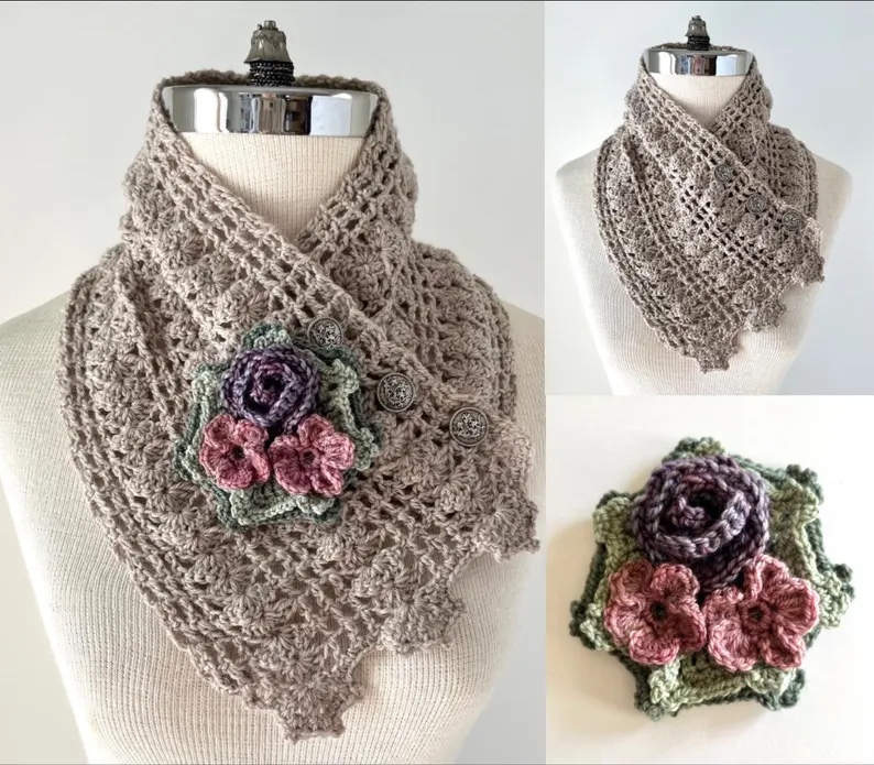NEW! Perfect for the upcoming fall and winter season. Lace Neck Warmer Scarf in various luxurious soft yarns available in 3 colours, beige, mauve and dark gray. Elegant lace scarves accented with beautiful floral brooches and metal floral buttons. Other similar styles and colours are available or coming soon on my other listings. This style of scarf is a great addition to any style. Warm and cozy with the ultra soft yarn and handmade and designed by myself just for you. The scarf base is also available as a crochet pattern so you can make your own.