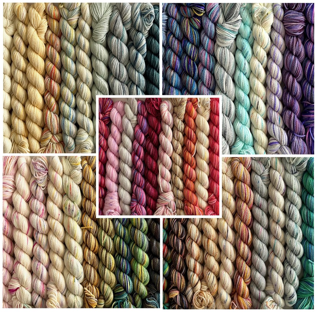 Made with 100% Merino Wool. There are 10 mini skeins in each pencil box at 87 yds/25g each mini skein giving you a total of 870 yards of beautiful hand painted yarn.