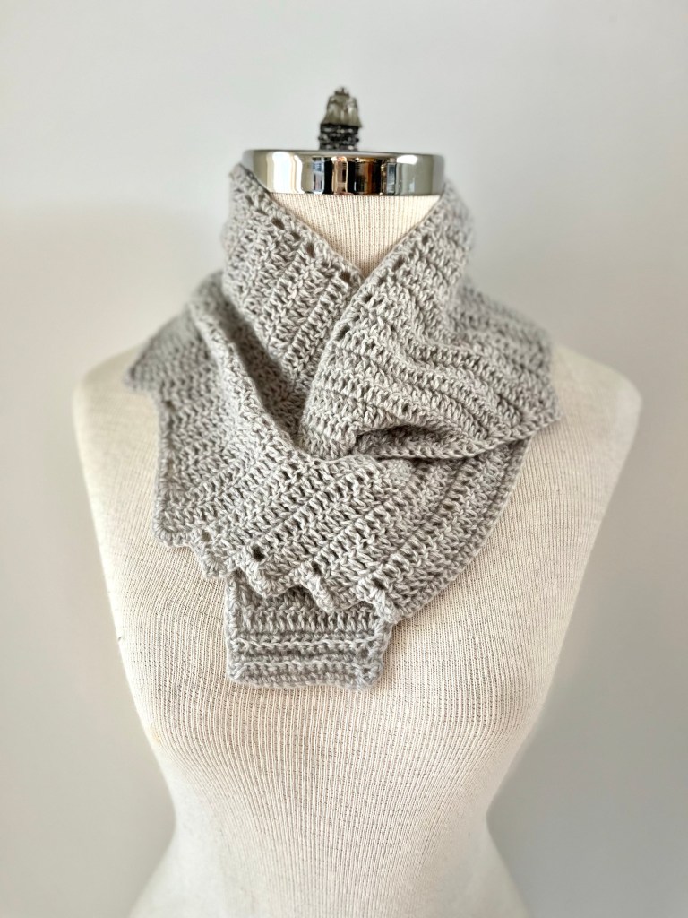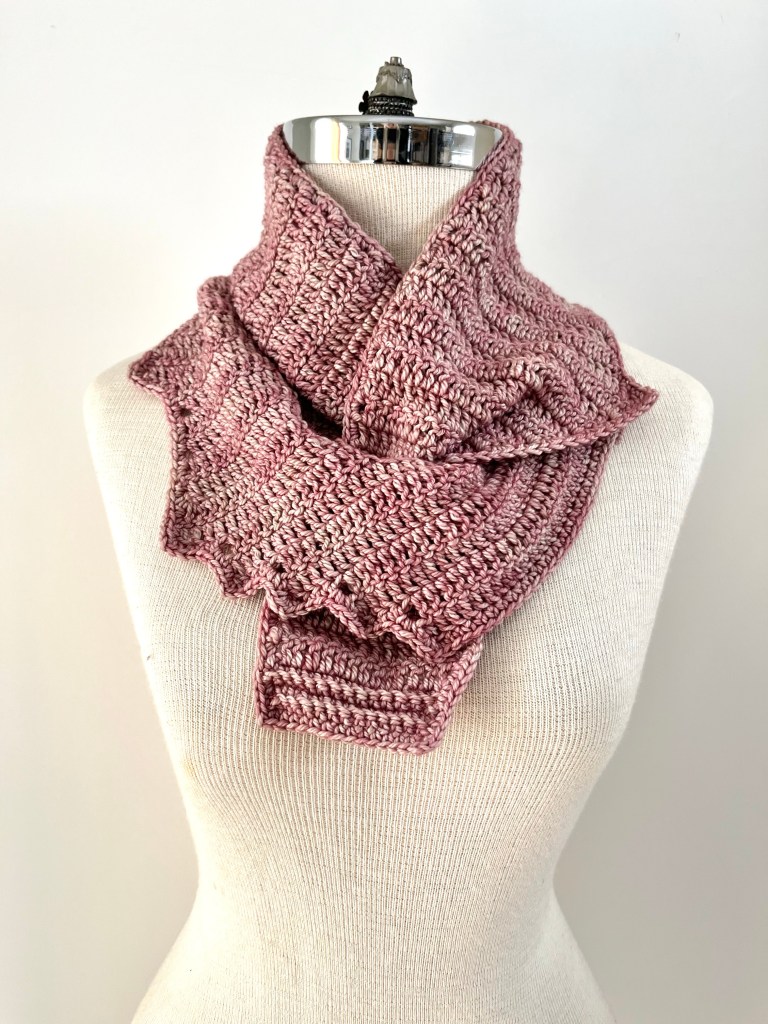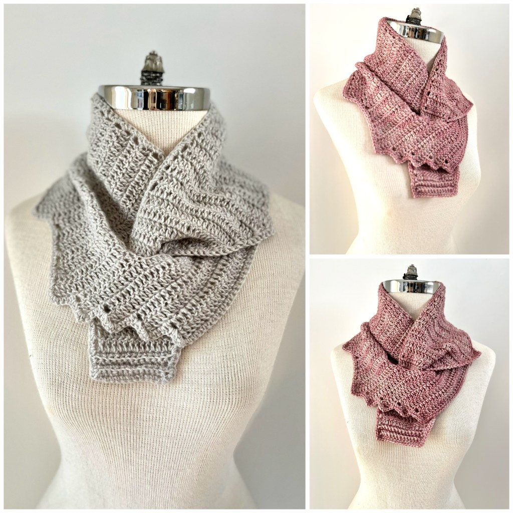 Yarn used: You can use most DK weight yarns. I used Cardiff Cashmere Classic for the grey scarf and Sweetgeorgia Yarns Superwash Merino Wool DK for the pink scarf. You need approximately 244yds/224 m DK weight yarn.