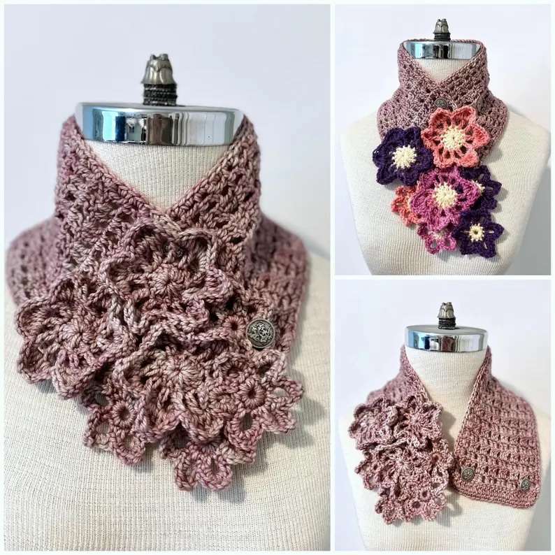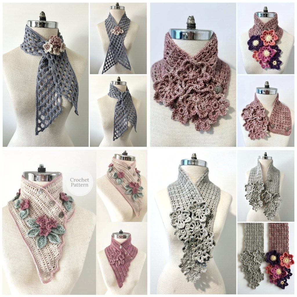 NEW! Crochet Pattern Collection Flowers, includes 4 crochet scarf patterns perfect for any wardrobe with a floral touch. REGULAR $28.00 TO PURCHASE ALL 4 PATTERNS SEPARATELY SAVING YOU $6.00. TOGETHER in this collection ONLY $22.00. Each pattern is designed by Valerie Baber Designs adding a unique touch to your wardrobe. Includes the Joyful Floral Lace Scarf, Flowers and Lace Neck Warmer, Flowers and Lace Scarf, Floral Blossoms Neck Warmer Scarf.